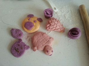 4色面团都揉吧揉吧,揉的越久口感越好,然后就可以做成你喜欢的图案了