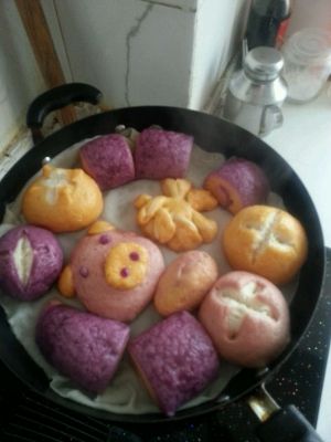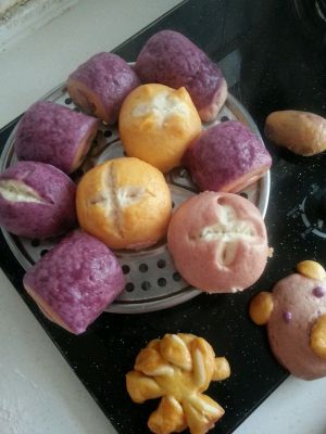 白面团和好了,紫薯和南瓜也都蒸熟了,把紫薯和南瓜放在俩容器了量凉,凉后的紫薯和南瓜分别加入200克白面和2克酵母和面,南瓜面团不用加水,因为南瓜本来就含的水分比较多;紫薯面团得加少许清水。都是和的面光盆光就可以啦!