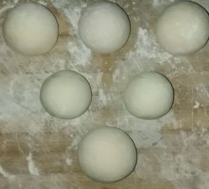 发酵好的面团,再揉面拍出气孔,之后每个面团分割成4等份。