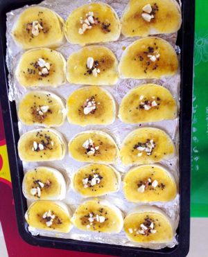 刷上蛋液,撒上芝麻和花生碎,放到铺了锡纸的烤盘上,把烤盘放入预热好的烤箱,选220度10分钟,两面金黄就可以了,好了之后,最好是放凉在从烤箱内拿出,这样比较酥脆