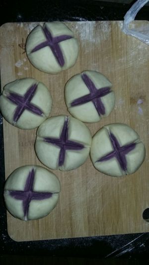 待两团面发好的时候,取出。再和面,排气;把两团面揉成大小一致的小团子。接下来开做了:把紫薯小面团揉成小丸子,再把小白面团压成圆面,压至饺子皮那样,再把丸子放至圆面上,包裹,定型,最后用到切两道口子即可。