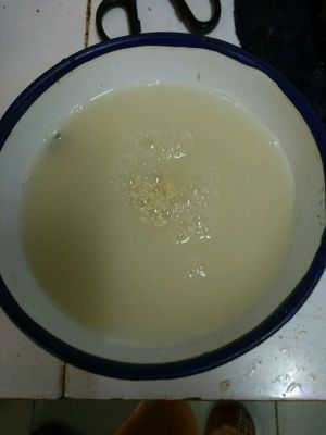 发酵粉,白糖倒入小碗,加水打发,盐可加可不加的,我加了一点盐,打发好的液体分两次倒入面粉碗,第一次倒的时候在面粉碗里中间挖开一点粉,倒入了用筷子拌几下再第二次倒入。