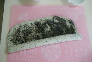 把黑芝麻粉和糖粉混合均匀撒在面饼上卷起来