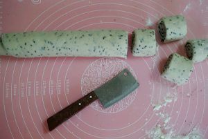 面团揉一揉排净空气,擀剂子。一份剂子如图,一个菠菜剂子稍微大一点,搭配三个白面团揉成的小球。