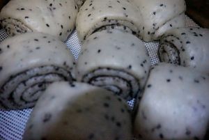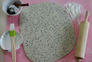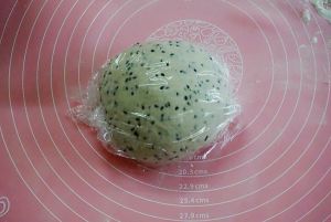 除卷入用材料(黑芝麻粉和糖粉)外其他全部加一起揉成光滑的面团,盖保鲜膜松弛10分钟
