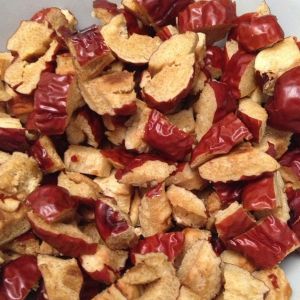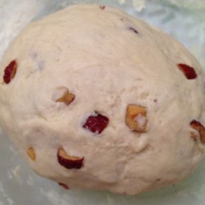 一次加入一些红枣碎,揉成面团,用刀切成小块