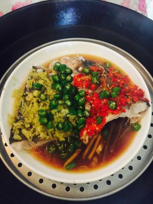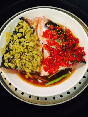 油烧热蒜蓉放进去炸香,盛出备用,葱,姜片摆盘,鱼头拍上炸过蒜的放进盘中上入上锅蒸三分钟,然后将盘里的腥水倒掉(不倒水会很腥)