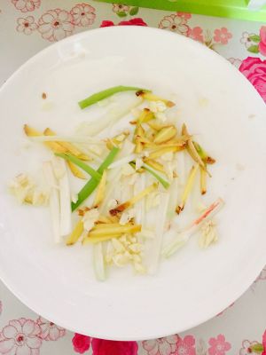 先把姜蒜切好,大葱切丝铺在盘里 鱼头洗干净