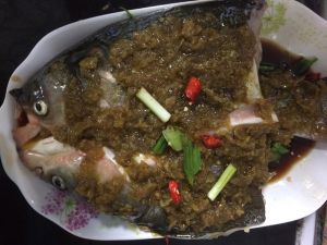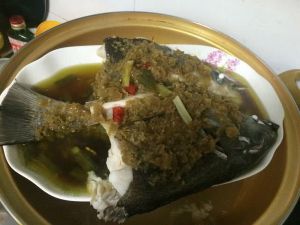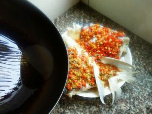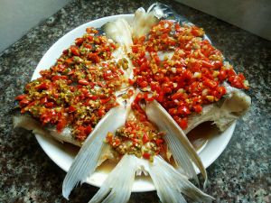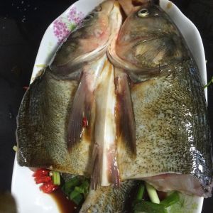 选择新鲜的鲢鱼 用盐腌制片刻 在鱼肚子里放置葱姜蒜和红辣椒去腥…在鱼表面均匀的抹上料酒 …浇上生抽➕鸡精➕少许白糖的调味汁…