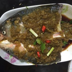 蒸锅放水开火,盘子中放姜片和葱段,把鱼头铺上面,铺上几片姜。水开后,放进去蒸3分钟,出锅倒掉血水。这时把剁椒均匀地铺在鱼头上面,再把金银蒜均匀地撒在上面,最后把炸过的油均匀地淋在上面,放进蒸锅中,加盖子,视鱼头大小蒸15-20分钟。