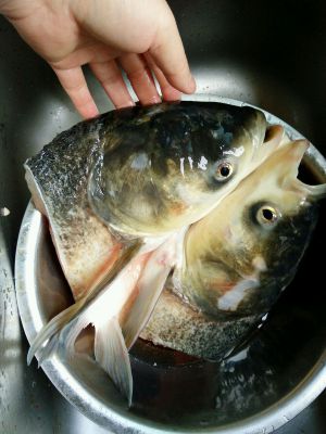 新鲜鱼头一个,菜市场老板娘帮我剁开了,拿回家洗干净就好了,一定要把那层黑膜洗干净!