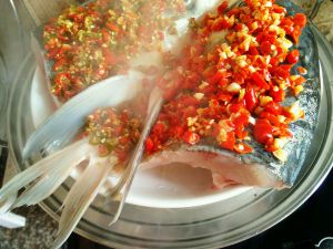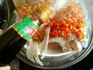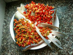 在鱼头表面浇上剁椒 也可一半剁椒 一半红辣椒