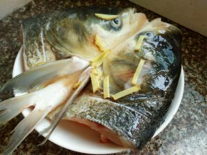 黄酒两勺倒在鱼头上面,两勺盐均匀的抹在鱼头,鱼肉上面放上姜片去腥提前腌制半小时入味!