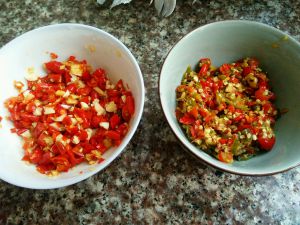 腌制好的鱼头,拿掉姜片,把盘子从小洗一下再把鱼头放进盘子里,铺上剁辣椒!