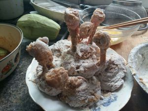 传统做法再用面粉挂糊,我家里有炸鸡裹粉,直接用了这个,每一块都要均匀沾满,用手揉搓出鳞片状