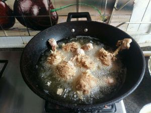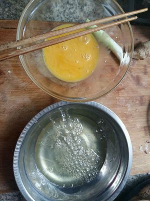 花生油适量,我习惯扔一个姜粒,当姜粒在油里浮起来,有姜的香味基本就100度,可以炸了