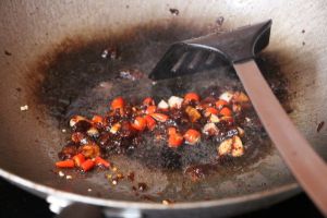 准备好辅料后,开始热油,放入辣椒,八角,桂皮,烧出香味,再放入三勺郫县豆瓣酱,烧出香味