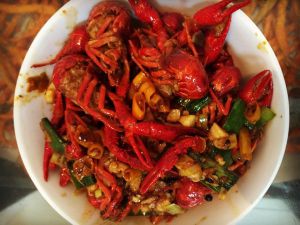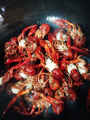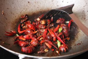 再放入小龙虾,爆炒,加入料酒少量,大概炒三四分钟,炒到龙虾变红色,开始加水煮,水量盖过龙虾量