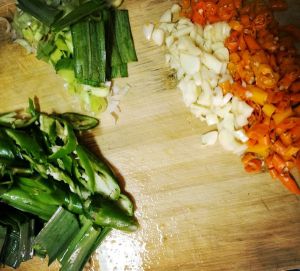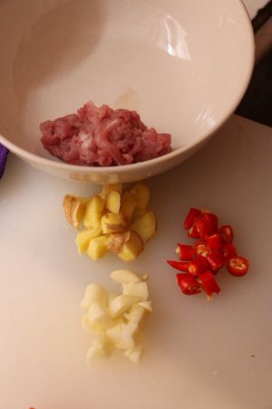 另外需要准备的 一点肉末(我妈妈以前炒口味虾都会放点肉末 炒田螺也会放) 姜蒜切碎一下 小米椒切碎