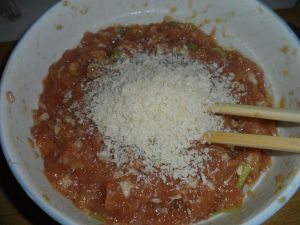 调好的馅料放入面包糠,每次加少量分2-3次加入,一共加入50g左右差不多就可以了,馅料不太稀,可挤成肉球为宜