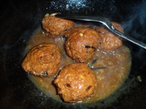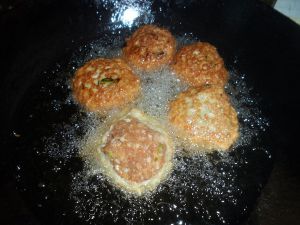 用双手把馅料挤成大小相同的肉球、下油锅炸至金黄,油温一定要热,这样肉下锅会迅速定型