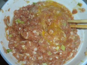 猪肉剁成肉馅,不要太细腻,保持点颗粒感,吃的时候口感更好。猪肉馅放入2勺盐,2颗鸡蛋、葱花适量、2汤匙海鲜酱油、半汤匙老抽、2汤匙料酒、1勺五香粉、1勺鸡精顺着一个方向搅拌至肉馅粘稠有韧性