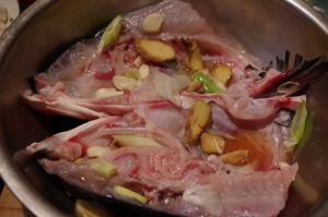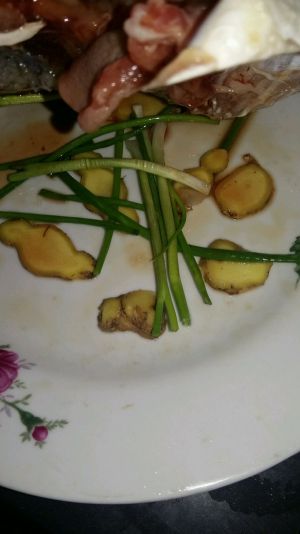 葱姜蒜放入鱼头下面,蒸5分钟把水倒掉去腥味儿