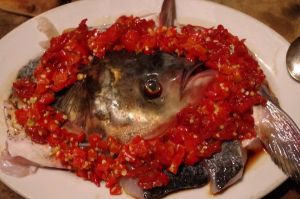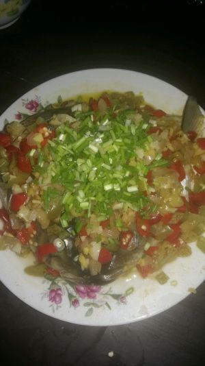葱姜蒜末铺鱼头上 浇热油即可出锅