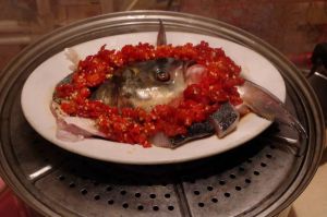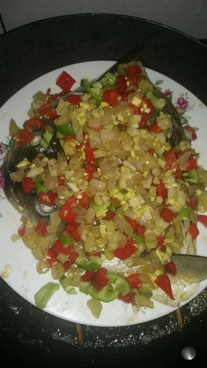 蒸五分钟后倒掉盘里的水,不然鱼会腥味重的,然后铺上各种是先准备好的调料再蒸十分钟