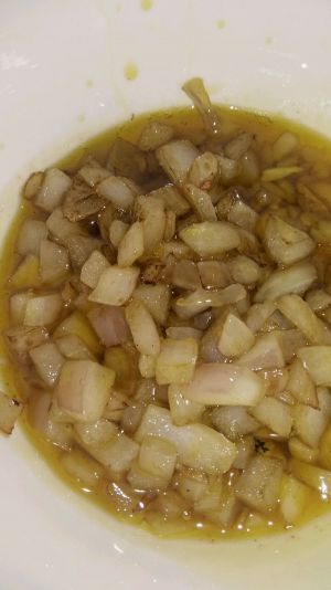 姜蒜和洋葱用油煸炒了一下,煸香成金黄色放小碗备用。