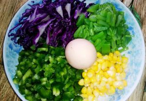 儿子的最爱紫甘蓝、青椒、扁豆、玉米 鸡蛋打散放少许盐和五香粉拌匀,把馒头切小块倒入蛋液中翻滚,让每块馒头都裹上蛋液