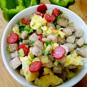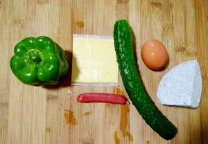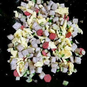 馒头切小丁,黄瓜切碎,小香肠切片,鸡蛋打撒炒成鸡蛋碎。