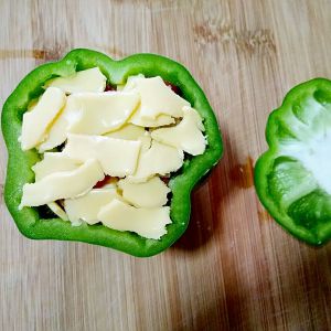 青椒盅填好后,再上面铺一层撕碎的芝士片。(芝士控们可以一层馒头,一层芝士的,多铺几层)