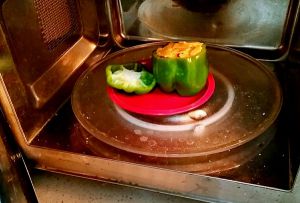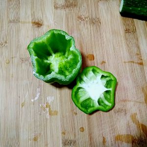 青椒一丝丝的甜,最后可以被吃掉。用青椒盅焗饭,碗都省的刷了呀!