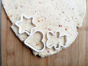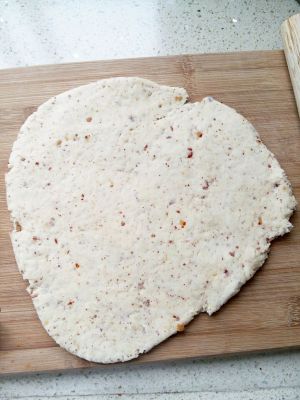 将面团拿出,放砧板上继续揉搓,然后用擀面杖擀平,大概厚度1CM左右