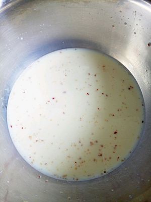 奶粉加酵母加温水一起搅拌。由于我的搅拌器粘着红枣,所以看起来有颗粒