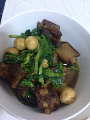 炒锅放油,加冰糖,熬至褐色,倒入排骨翻炒,糖汁均匀沾满排骨,加入葱姜,生抽,老抽,大料,桂皮炒香后,加排骨汤。加鹌鹑蛋。大火烧开,小火焖烧40分钟,大火收汁,可以加点青菜。可以上桌喽。
