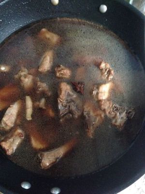 翻炒均匀后,倒入没过排骨五分之四的水,放入两颗八角,一块如图中那么大的冰糖。