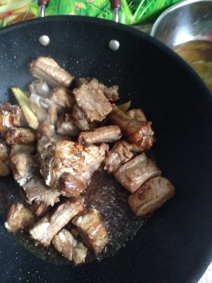 倒入排骨 翻炒两分钟左右 把油爆出排骨 到老抽上色 (扑鼻的香味我就不形容了(☆_☆)