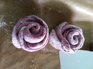 取6小块面剂擀成圆形,依次累叠卷起成,中间刮板对切成玫瑰花。