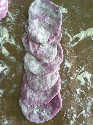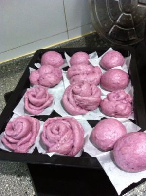 发酵完成后,将白面团和紫面团分别揉成均匀的小面团;