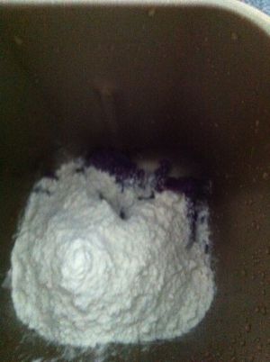 除水外所有原料倒入面包机中揉面加发酵,因紫薯泥含水份,水分多次少量加入