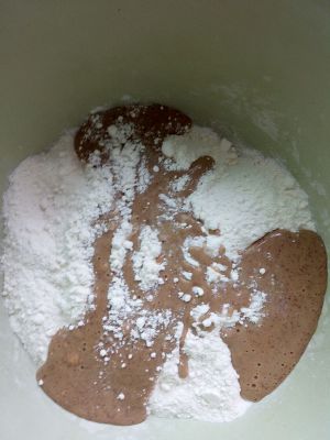 面放盆里,扒开一个洞洞,把酵母水倒进去。