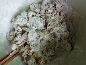 我一共用了460ml水,将面和成这样的雪花状,十分干,好,不要再加水了,继续揉,坚持揉,把干面全都揉进去,不要放弃,坚持就是胜利!