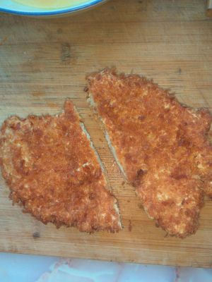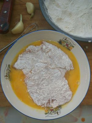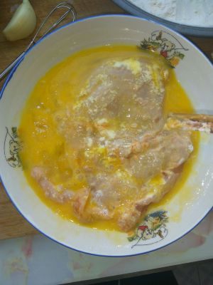 鸡胸肉洗净,对半切开,用刀背给它拍散一下,放盐,料酒,黑胡椒粉,一个蛋清腌制半个小时左右