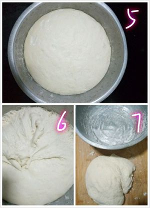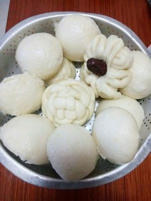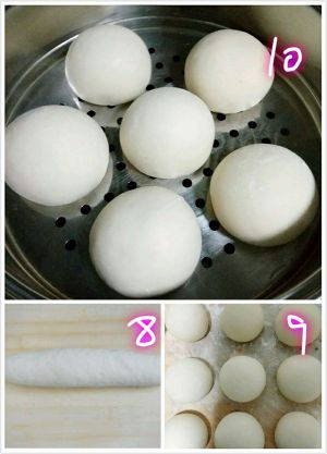 开始揉面,揉至差不多原来体积大小,感觉多余空气全部被挤出,这个过程大约5分钟,再搓成长圆柱形,分成小剂子,然后整形,静置20分钟,开始上锅蒸;
