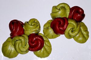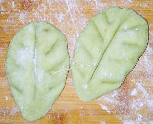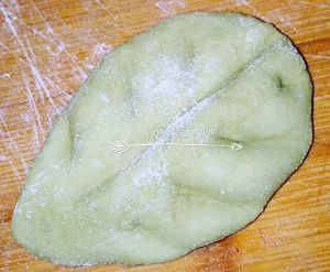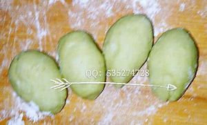 绿色面团也同样搓长条切小剂子,幹成饺子皮,切成如图的细长三角型,刷点水。