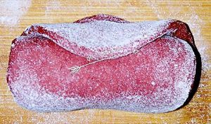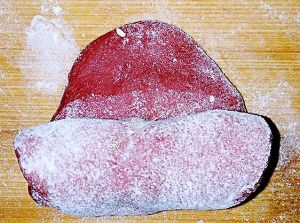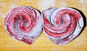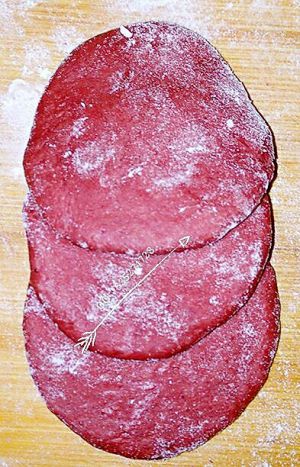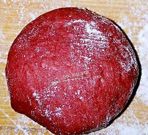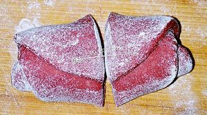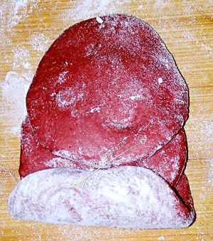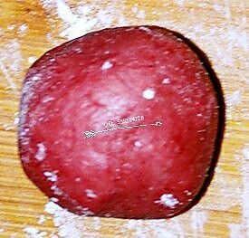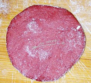 150克面粉加1克红曲粉和1.5克酵母混合揉成粉色面团盖保鲜膜备用。