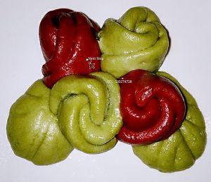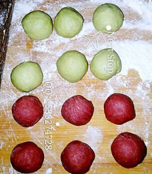 将红曲面团分成6个15克一个的小面团,抹茶面团也分成6个15克一个的小面团。 剩下的抹茶面团再均分成4个小面团待用。
