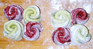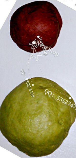 将60%的面团加入抹茶粉、40%的面团加入红曲粉。